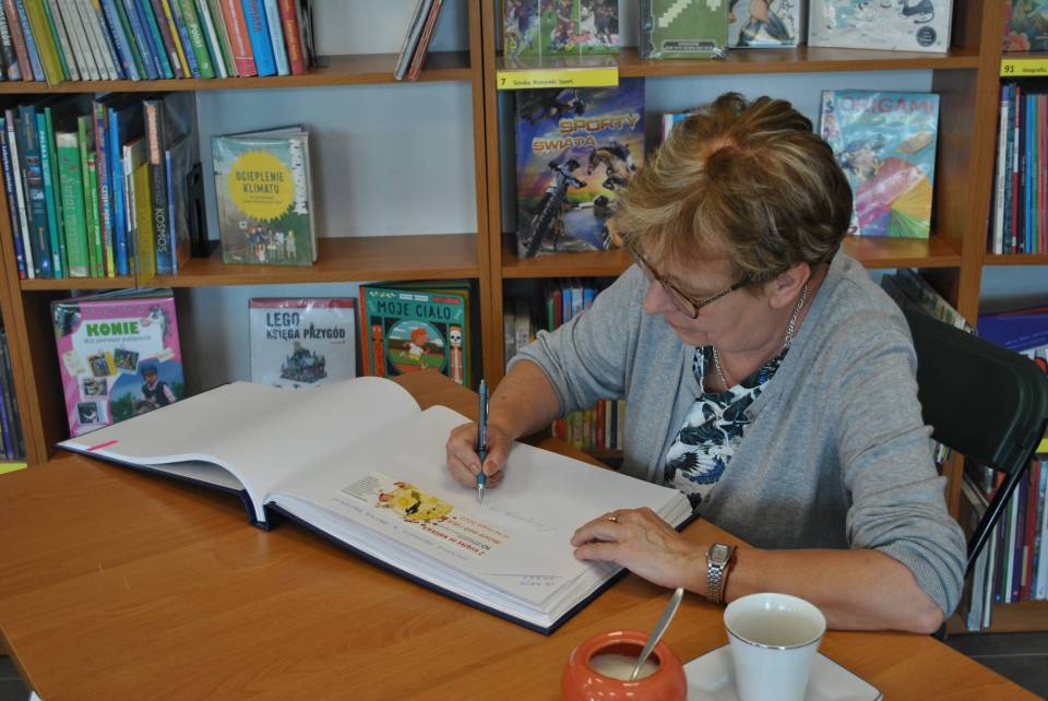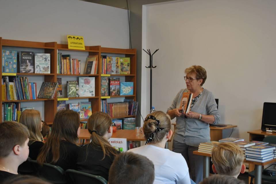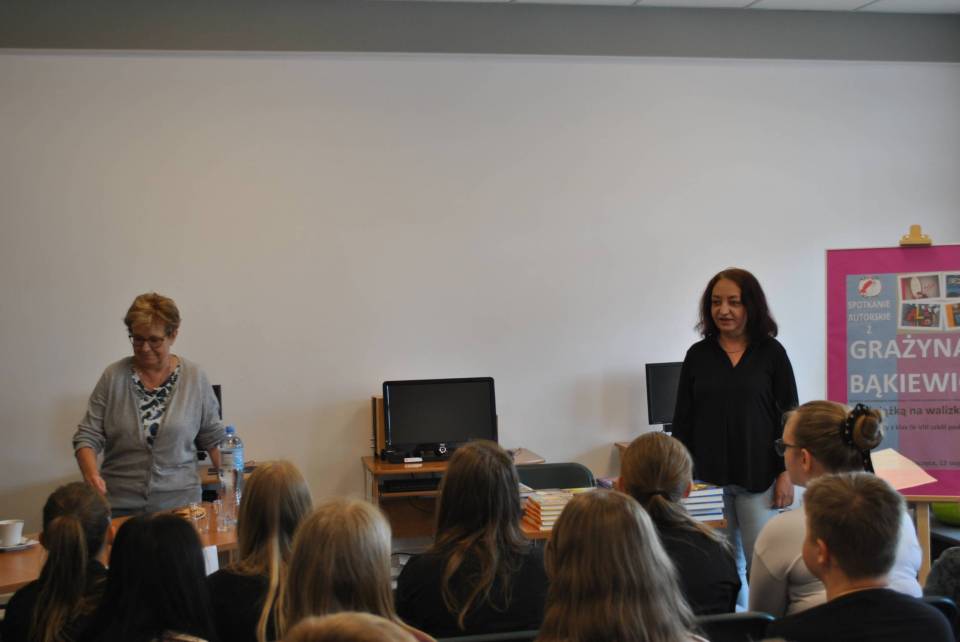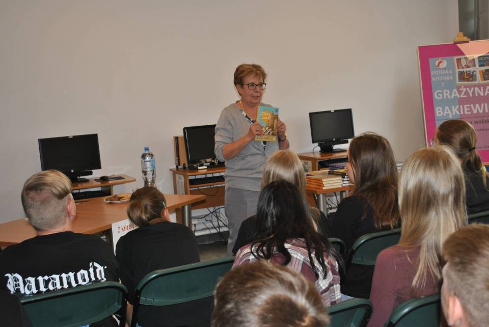 Grażyna Bąkiewicz opowiadała o swojej twórczości, mówiła skąd czerpie inspiracje do pisania książek. Zdradziła, że często opisuje sytuacje, które miały miejsce w rzeczywistości, bo samo życie kreśli takie historie jakich nie wymyśli żaden pisarz. Dzięki jej opowieściom uczestnicy spotkania mogli przekonać się, że także historia Polski jest barwna i ciekawa, pełna nieoczekiwanych zwrotów akcji i trzymających w napięciu wydarzeń. Po spotkaniu młodzież miała okazję zakupić książki autorki i zdobyć cenny autograf z dedykacją. Miła atmosfera spotkania z pewnością na długo pozostanie w ich pamięci.