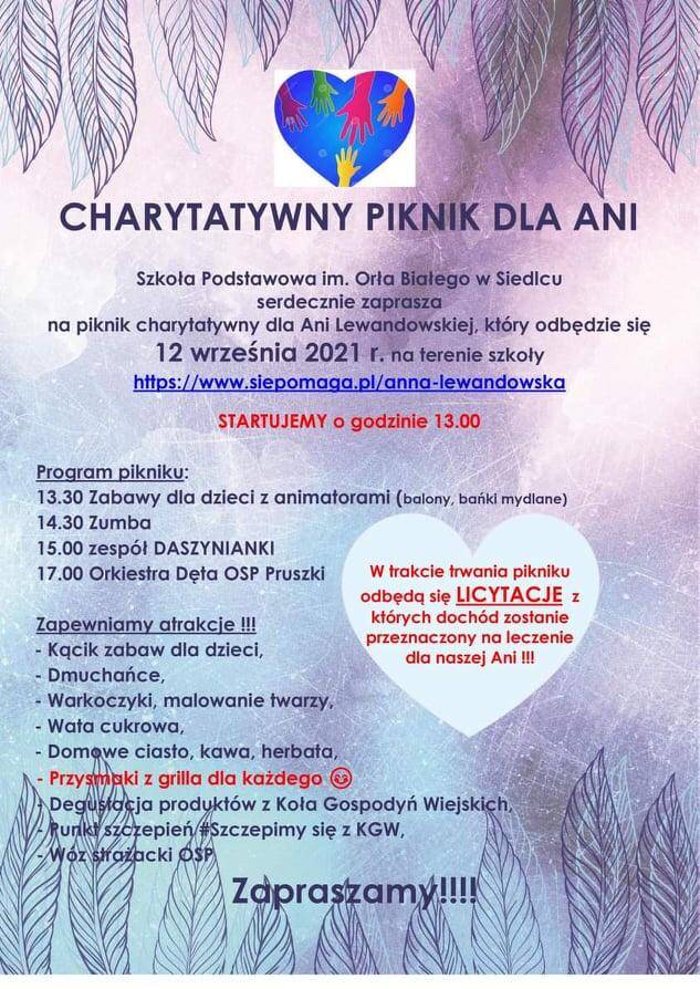 Szkoła Podstawowa im. Orła Białego w Siedlcu serdecznie zaprasza na Piknik Charytatywny dla Ani Lewandowskiej. Wydarzenie odbędzie się w niedzielę, 12 września na terenie szkoły w Siedlcu, początek o godzinie 13:00.