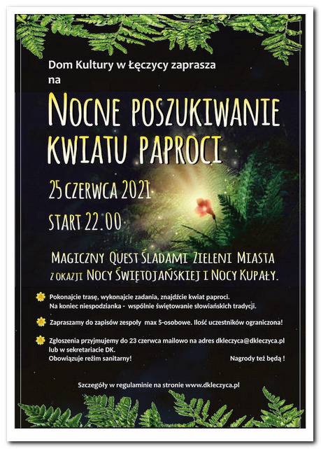 Dom Kultury w Łęczycy zaprasza na Nocne poszukiwanie kwiatu paproci, które odbędzie się w piątek, 25 czerwca o godzinie 22:00.