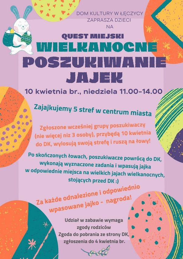 Dom Kultury w Łęczycy zaprasza na quest miejski "Wielkanocne Poszukiwanie Jajek", który odbędzie się 10 kwietnia w godzinach 11:00 - 14:00.