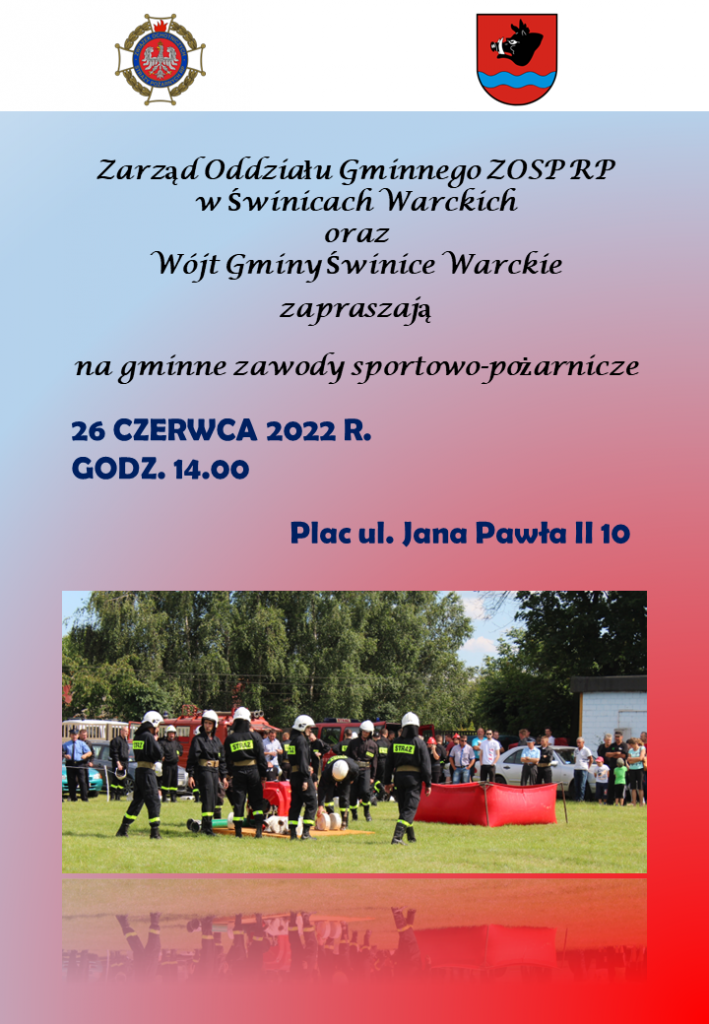 Zarząd Oddziału Gminnego ZOSP RP w Świnicach Warckich oraz Wójt Gminy Świnice Warckie zapraszają na Gminne Zawody Sportowo-Pożarnicze.