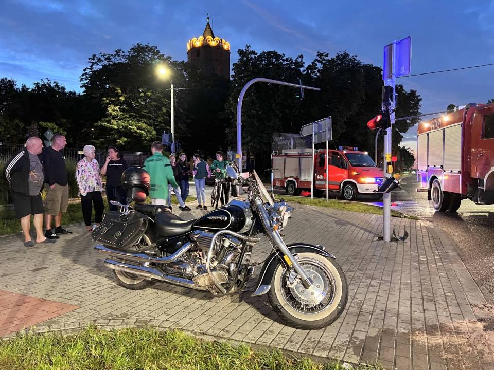 Kierujący motocyklem - 47-letni mężczyzna, chcąc uniknąć zdarzenia, gwałtownie skręcił w prawo, uderzając w słup sygnalizacji przejścia dla pieszych, w tym głową uszkadzając sygnalizator.