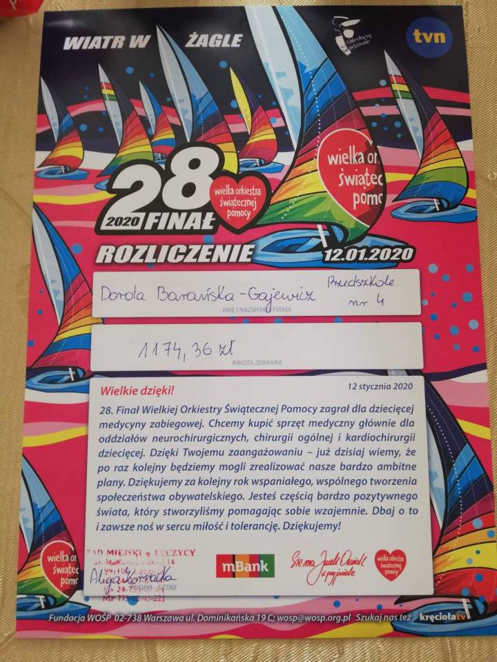 Jak co roku w styczniu, Przedszkole nr 4 w Łęczycy wzięło udział w Wielkiej Orkiestrze Świątecznej Pomocy. Do naszej wspólnej imprezy przyłączyło się mnóstwo dzieci i rodziców. Było przedstawienie jasełkowe i koncert kolęd w wykonaniu naszych przedszkolaków oraz wesołe tańce i zabawy integrujące.