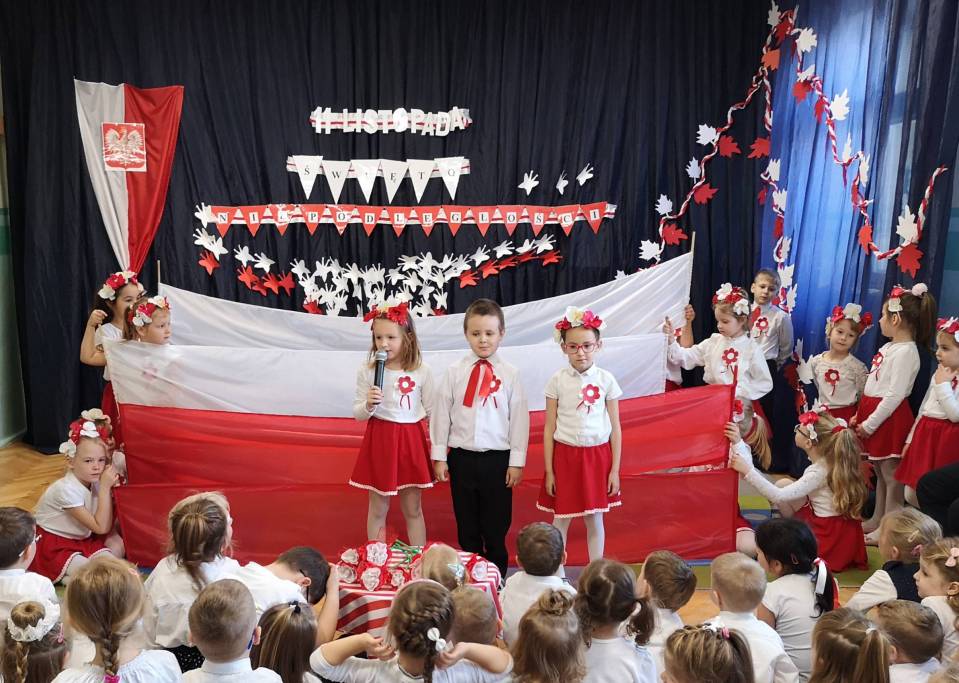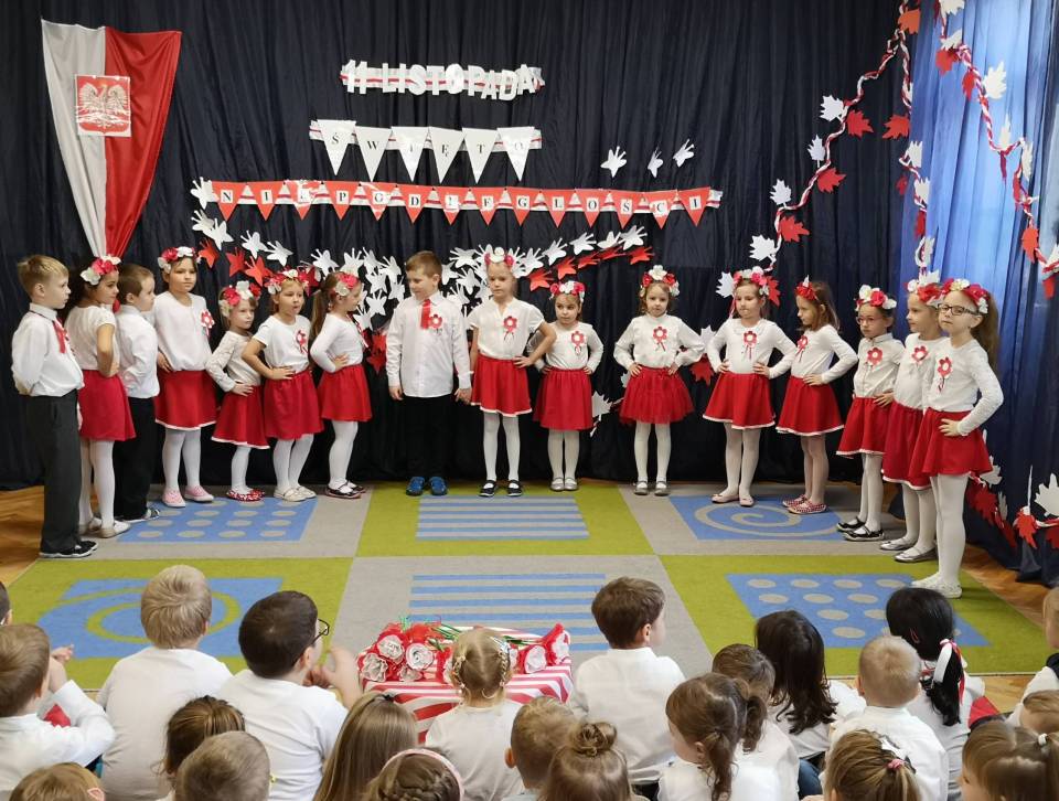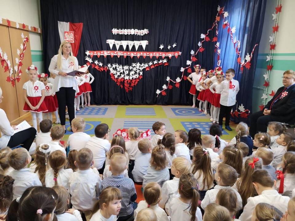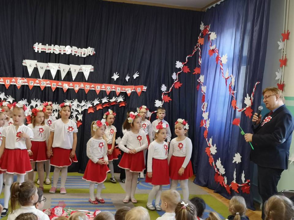 Dzień Niepodległości 11 listopada to najważniejsze polskie święto narodowe, upamiętniające rocznicę odzyskania przez Naród Polski niepodległości. Dzieci z grupy najstarszej pod opieką swoich nauczycieli – Haliny Murawskiej i Agaty Owczarek - zaprezentowały montaż słowno-muzyczno-taneczny, w którym opowiedziały walkę narodu polskiego o wolność. Słowem i piosenką oddały szacunek symbolom narodowym, symbolom walki o wolność i zwycięstwo oraz miłość do Ojczyzny. Przedszkolaki uroczyście odśpiewały cztery zwrotki hymnu. Recytatorskie i wokalne umiejętności przedszkolaków nagrodzone zostały gromkimi brawami, a także gestami wzruszenia, a ich przygotowanie, zaangażowanie, postawa patriotyczna i artystyczny talent - doceniony przez P. Edwarda Banasika Sekretarza Miasta Łęczyca, który w słowach podziękowania - życzył wszystkim dzieciom dalszych sukcesów, uśmiechu i samych radosnych chwil.