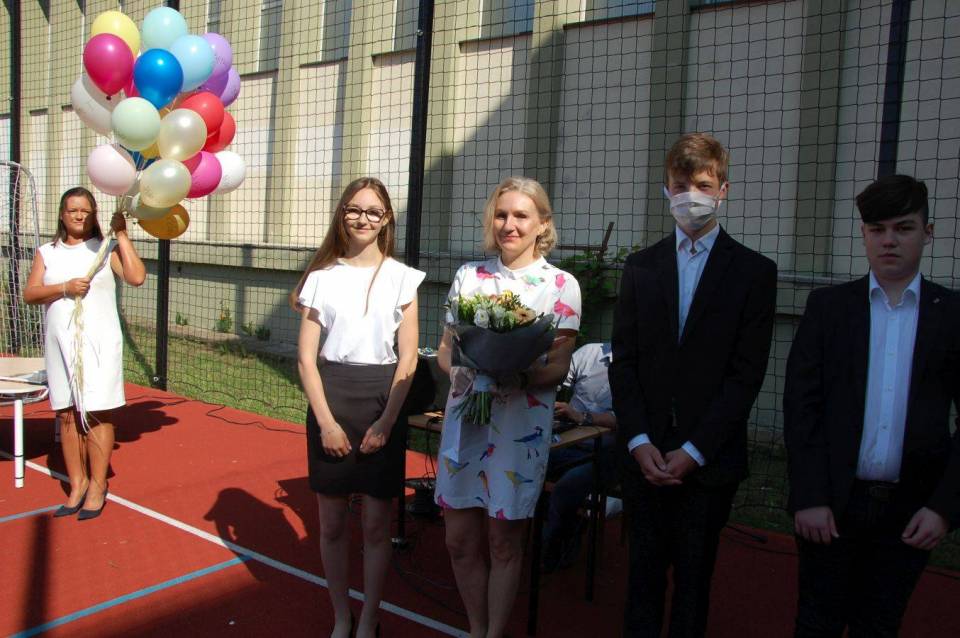 Pani Dyrektor Wanda Lepczak wręczyła następnie nagrody 6 uczniom kończącym szkołę z wyróżnieniem. Otrzymali je: Maja Jagiełło (średnia ocen końcowych 5,53), AdamTrojak (średnia ocen 5,42) , Ryszard Janica (średnia ocen 5,32), Maksymilian Błaszczyk (średnia ocen 5,21), Adam Nowakowski (średnia ocen 5,21) oraz Jakub Lubowiecki (średnia ocen 4,80). 5 uczniów z tego grona otrzymało stypendium naukowe, natomiast Rada Rodziców dodatkowo nagrodziła Maję, Adama i Ryszarda jako wyraz uznania dla ich najwyższych wyników w nauce oraz aktywności w ramach Samorządu Uczniowskiego, Pocztu Sztandarowego czy też wolontariatu.