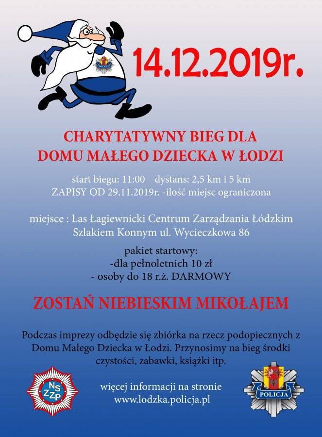 14 grudnia 2019 roku Komenda Wojewódzka Policji w Łodzi organizuje Charytatywny Bieg dla Domu Małego Dziecka w Łodzi pod hasłem .„Zostań Niebieskim Mikołajem". Po wcześniejszej rejestracji czekamy na starcie o godz. 11:00 w Lesie Łagiewnickim przy ul. Wycieczkowej 86 w Łodzi (Centrum Zarządzania Szlakiem Konnym). Bieg odbędzie się na dystansie: 2,5 km i 5 km. Każdy może wspomóc podopiecznych tego wyjątkowego Domu przynosząc najbardziej potrzebne przedmioty takie jak środki higieniczne, odzież.
